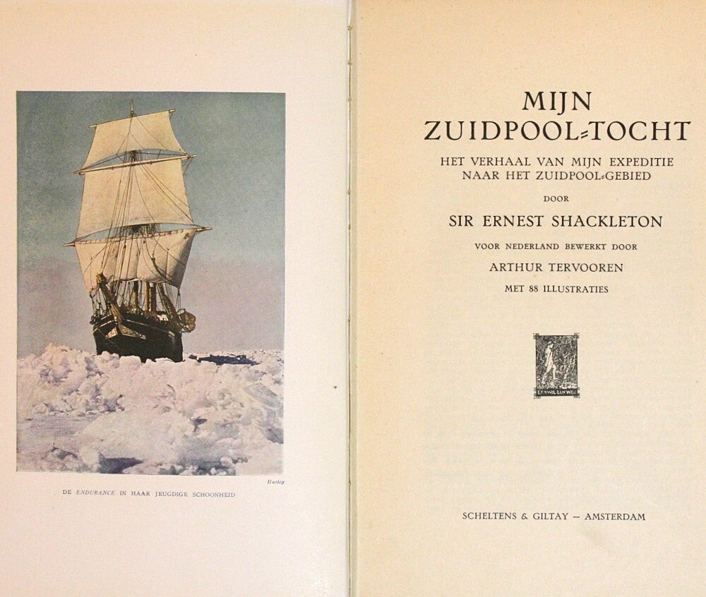 Scarce first edition, not dated, but according to newspaper ads published in november 1921 (“De meest avontuurlijke ontdekkingstocht, welke ooit heeft plaats gehad. Een heldentocht van moed en wilskracht, van bovenmenschenlijken strijd en volharding”). Bound with a round back, later editions with a flat back and different vignets. Translation of “South”.